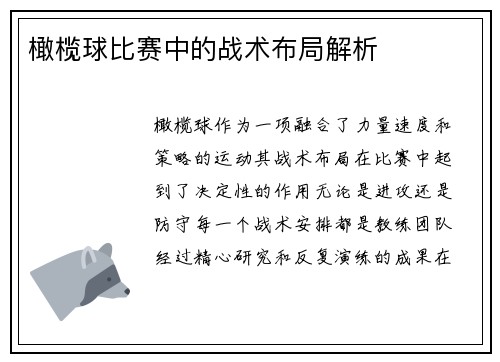 在橄榄球比赛中,进攻战术的设计与执行是取得胜利的关键因素之一。有效地突破对方防线,不仅需要优秀的个人技术,还依赖于团队的配合、战术的安排与灵活的应对能力。本文将深入探讨橄榄球的进攻战术,帮助球队在比赛中找到突破对方防线的有效途径。并结合万博体育提供的资源来促进这一目标的实现。
